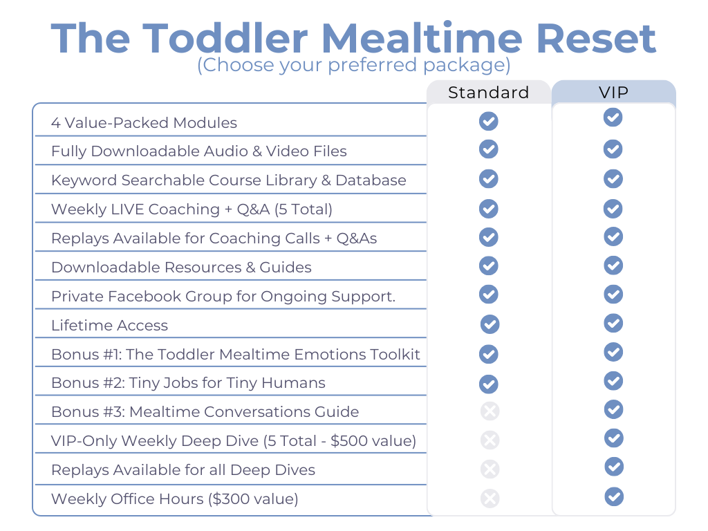 After 14 days inside The Toddler Mealtime Reset, you’ll have access to the first two modules and start trying out some of the core strategies, like setting a realistic behavior goal, using toddler-friendly mealtime routines, and practicing calm communication.
